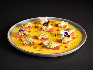 Finas láminas de atún con salsa huancaína de pescado, guacamole acevichado, pimentón y flores comestibles.