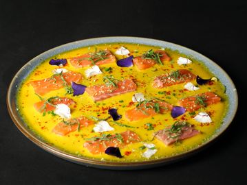 Tiradito de salmón en salsa de maracuyá y mango, con merkén, ciboulette, zeste de limón, menta y flores comestibles.